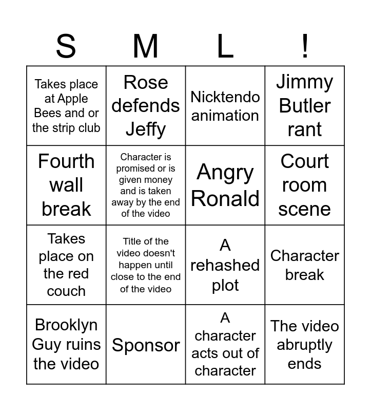 This bingo card has 16 words: Sponsor, Character break, Nicktendo animation, Takes place at Apple Bees and or the strip club, Takes place on the red couch, Rose defends Jeffy, A rehashed plot, A character acts out of character, Fourth wall break, Character is promised or is given money and is taken away by the end of the video, Brooklyn Guy ruins the video, Jimmy Butler rant, Title of the video doesn't happen until close to the end of the video, Court room scene, Angry Ronald and The video abruptly ends.