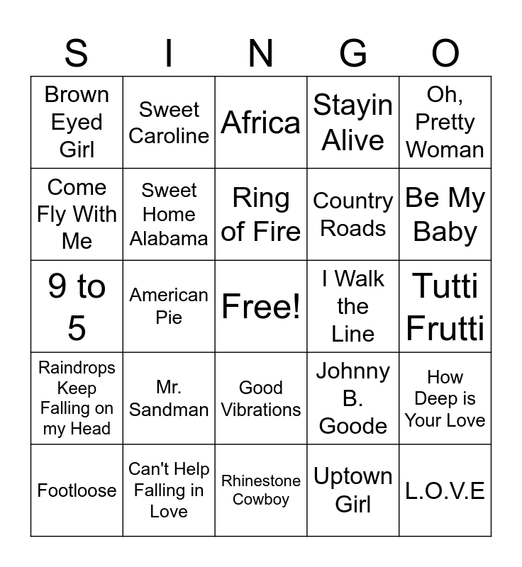 This bingo card has a free space and 39 words: Jack and Diane, Boogie Fever, We are Family, Sweet Home Alabama, Footloose, Good Vibrations, Ring of Fire, Return to Sender, Oh, Pretty Woman, Raindrops Keep Falling on my Head, American Pie, Stayin Alive, L.O.V.E, Tutti Frutti, I Walk the Line, Mr. Sandman, Hey, Good Lookin, Brown Eyed Girl, Dancing Queen, Johnny B. Goode, Come Fly With Me, Rhinestone Cowboy, Country Roads, Be My Baby, Dream a Dream, Twist and Shout, Ain't No Mountain High Enough, Build Me Up Buttercup, At Last, Sweet Caroline, Check Yes Or No, Walkin on Sunshine, Africa, Can't Help Falling in Love, Uptown Girl, September, How Deep is Your Love, 9 to 5 and Mr. Blue Sky.