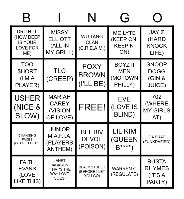This bingo card has a free space and 24 words: JUNIOR M.A.F.I.A. (PLAYERS ANTHEM), JANET JACKSON (THAT'S THE WAY LOVE GOES), FOXY BROWN (I'LL BE), FAITH EVANS (LOVE LIKE THIS), JAY Z (HARD KNOCK LIFE), DRU HILL (HOW DEEP IS YOUR LOVE FOR ME), TOO $HORT (I'M A PLAYER), MISSY ELLIOTT (ALL IN MY GRILL), EVE (LOVE IS BLIND), BEL BIV DEVOE (POISON), BOYZ II MEN (MOTOWN PHILLY), USHER (NICE & SLOW), LIL KIM (QUEEN B****), DA BRAT (FUNKDAFIED), TLC (CREEP), WARREN G (REGULATE), 702 (WHERE MY GIRLS AT), WU TANG CLAN (C.R.E.A.M.), SNOOP DOGG (GIN & JUICE), MARIAH CAREY (VISION OF LOVE), BUSTA RHYMES (IT'S A PARTY), CHANGING FACES (G.H.E.T.T.O.U.T.), MC LYTE (KEEP ON, KEEPIN' ON) and BLACKSTREET (BEFORE I LET YOU GO).