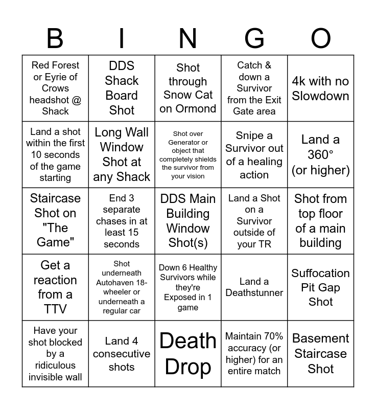 This bingo card has 25 words: Shot underneath Autohaven 18-wheeler or underneath a regular car, Death Drop, Shot over Generator or object that completely shields the survivor from your vision, Have your shot blocked by a ridiculous invisible wall, 4k with no Slowdown, Red Forest or Eyrie of Crows headshot @ Shack, Land a shot within the first 10 seconds of the game starting, DDS Shack Board Shot, Land a Shot on a Survivor outside of your TR, Down 6 Healthy Survivors while they're Exposed in 1 game, Snipe a Survivor out of a healing action, Staircase Shot on "The Game", Land a Deathstunner, Suffocation Pit Gap Shot, Long Wall Window Shot at any Shack, Basement Staircase Shot, Shot from top floor of a main building, Shot through Snow Cat on Ormond, Land a 360° (or higher), End 3 separate chases in at least 15 seconds, DDS Main Building Window Shot(s), Land 4 consecutive shots, Get a reaction from a TTV, Catch & down a Survivor from the Exit Gate area and Maintain 70% accuracy (or higher) for an entire match.