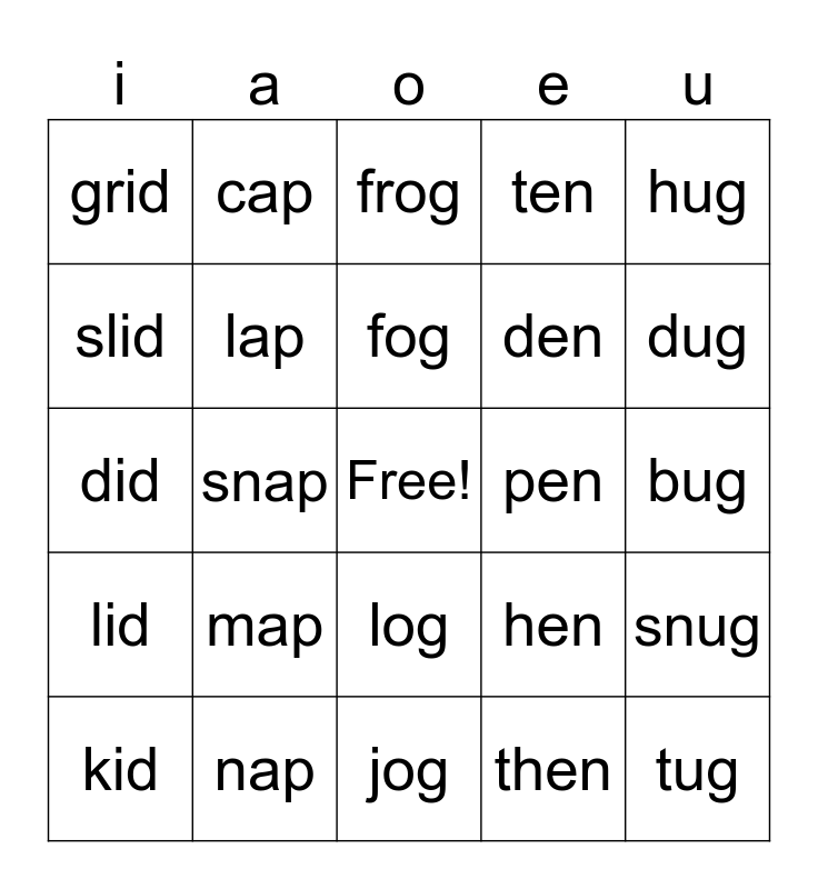 This bingo card has a free space and 24 words: kid, map, fog, then, hug, grid, cap, frog, pen, bug, did, lap, hen, snug, slid, nap, jog, ten, dug, lid, snap, log, den and tug.