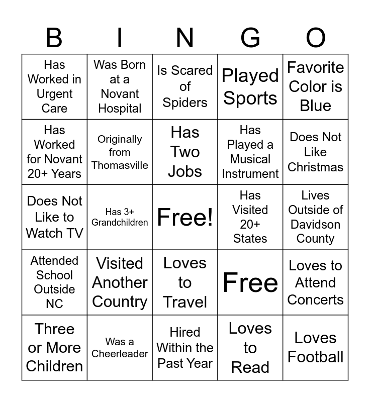 This bingo card has a free space and 25 words: Visited Another Country, Hired Within the Past Year, Has Two Jobs, Three or More Children, Favorite Color is Blue, Has Worked in Urgent Care, Has Worked for Novant 20+ Years, Was Born at a Novant Hospital, Has Visited 20+ States, Loves to Travel, Has Played a Musical Instrument, Does Not Like to Watch TV, Free, Loves to Attend Concerts, Originally from Thomasville, Has Worked for 2+ Healthcare Systems, Lives Outside of Davidson County, Is Scared of Spiders, Does Not Like Christmas, Has 3+ Grandchildren, Loves Football, Was a Cheerleader, Attended School Outside NC, Played Sports and Loves to Read.