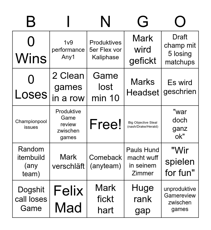 This bingo card has a free space and 24 words: Mark verschläft, Felix Mad, Game lost min 10, Dogshit call loses Game, Draft champ mit 5 losing matchups, 0 Wins, 0 Loses, 1v9 performance Any1, Big Objective Steal (nash/Drake/Herald), Comeback (anyteam), Marks Headset, Championpool issues, Pauls Hund macht wuff in seinem Zimmer, "Wir spielen for fun", 2 Clean games in a row, Huge rank gap, "war doch ganz ok", Produktives 5er Flex vor Kaliphase, Es wird geschrien, Produktive Game review zwischen games, unproduktive Gamereview zwischen games, Random itembuild (any team), Mark wird gefickt and Mark fickt hart.