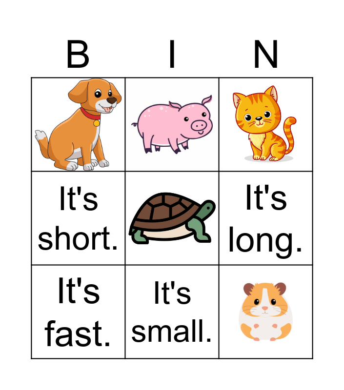 This bingo card has 9 images and 7 words: Free!, It's long., It's short., It's big., It's small., It's fast. and It's slow..