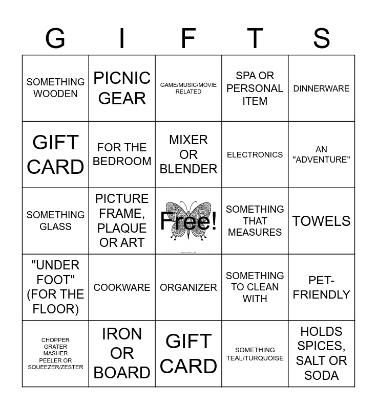 This bingo card has a free space and 24 words: COOKWARE, IRON OR BOARD, MIXER OR BLENDER, CHOPPER GRATER MASHER PEELER OR SQUEEZER/ZESTER, DINNERWARE, SOMETHING WOODEN, GIFT CARD, PICNIC GEAR, SOMETHING THAT MEASURES, ORGANIZER, ELECTRONICS, SOMETHING GLASS, SOMETHING TO CLEAN WITH, PET-FRIENDLY, FOR THE BEDROOM, SOMETHING TEAL/TURQUOISE, TOWELS, GAME/MUSIC/MOVIE RELATED, AN "ADVENTURE", PICTURE FRAME, PLAQUE OR ART, HOLDS SPICES, SALT OR SODA, "UNDER FOOT" (FOR THE FLOOR), SPA OR PERSONAL ITEM and GIFT CARD.