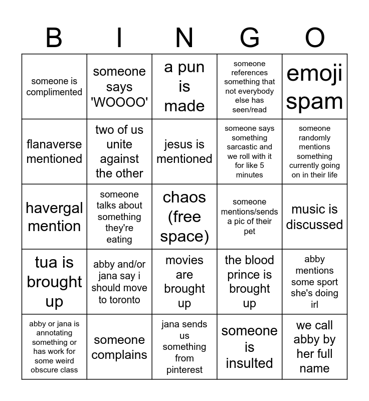 This bingo card has a free space and 24 words: abby and/or jana say i should move to toronto, someone complains, jesus is mentioned, abby or jana is annotating something or has work for some weird obscure class, emoji spam, someone is complimented, flanaverse mentioned, someone says 'WOOOO', someone mentions/sends a pic of their pet, movies are brought up, someone says something sarcastic and we roll with it for like 5 minutes, havergal mention, the blood prince is brought up, abby mentions some sport she's doing irl, two of us unite against the other, someone is insulted, music is discussed, a pun is made, someone randomly mentions something currently going on in their life, someone talks about something they're eating, we call abby by her full name, tua is brought up, someone references something that not everybody else has seen/read and jana sends us something from pinterest.