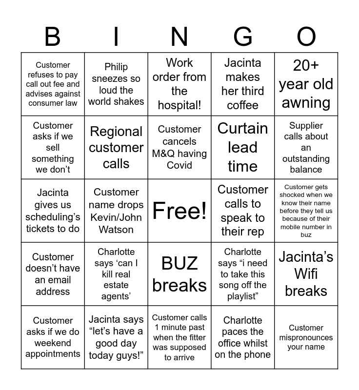 This bingo card has a free space and 51 words: Customer demands to speak to the owners, Customer mispronounces your name, Customer calls Nidhi ‘Libby’, Customer calls 1 minute past when the fitter was supposed to arrive, Charlotte says ‘can I kill real estate agents’, Taylah already asks to go home before 12., Philip sneezes so loud the world shakes, Voip breaks….again, Customer asks if we sell something we don’t, Customer asks if we sell blinds, Regional customer calls, Jacinta makes her third coffee, Jacinta’s Wifi breaks, Charlotte says “i need to take this song off the playlist”, Philip says ‘on jah’, Philip says “hey Boss”, Customer cancels M&Q having Covid, Customer calls to speak to their rep, “Someone tried calling me”, 20+ year old awning, Customer name drops Kevin/John Watson, Charlotte paces the office whilst on the phone, Customer refuses to pay call out fee and advises against consumer law, Curtain lead time, Fabric back order, Customer asks about repairs to a blind that's not ours, Supplier calls about an outstanding balance, Lisa asks if we have capacity, Customer asks if we do weekend appointments, Work order from the hospital!, Taylah Swearing, Philip Calls Taylah Taylah, Jacinta says she'll beat us in tickets, Customer calls Honeycombs “cellular blinds”, Jacinta bemoans the state of her debtors list, Jacinta says “let’s have a good day today guys!”, Daniella gets us to print something, Ticket numbers are compared, Jacinta says “as per my whiteboard” when we ask her a question about scheduling, Someone refers to Jamie as “your sister” when talking to Taylah instead of calling her Jamie, Customer gets shocked when we know their name before they tell us because of their mobile number in buz, Customer doesn’t have an email address, Customer is outside of our service area, Charlotte threatens BUZ with violence, Customer tells you their life story, Customer tries to get you to pick the colour, Jacinta gives us scheduling’s tickets to do, Natalie has a new hairstyle, Customer brings up 10 year warranty for a product with a 2 year warranty, BUZ breaks and Broken chain.