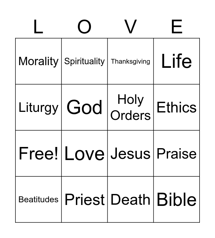 This bingo card has 20 words: Praise, Vocation, Thanksgiving, Charity, Beatitudes, Liturgy, Priest, Morality, Free!, Spirituality, Love, Jesus, God, Bible, Holy Orders, Happiness, Ethics, Life, Death and Resurrection.