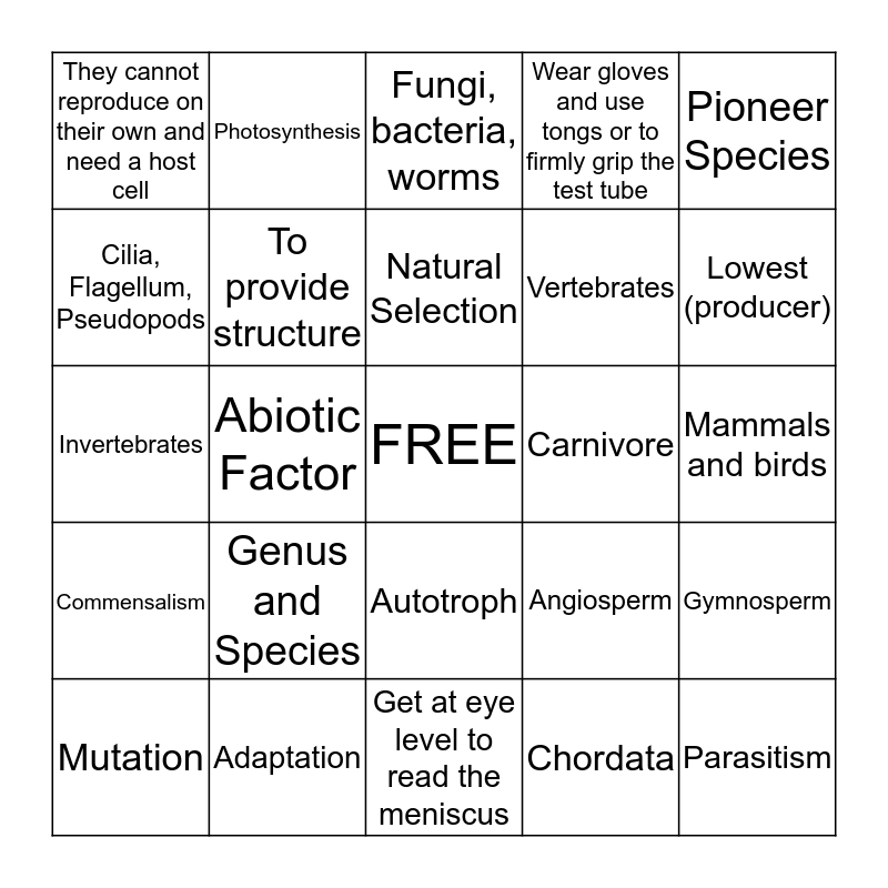 This bingo card has a free space and 24 words: Genus and Species, Adaptation, Natural Selection, Mutation, Pioneer Species, They cannot reproduce on their own and need a host cell, Cilia, Flagellum, Pseudopods, Photosynthesis, Carnivore, Autotroph, Vertebrates, Invertebrates, Angiosperm, Gymnosperm, To provide structure, Chordata, Mammals and birds, Fungi, bacteria, worms, Lowest (producer), Abiotic Factor, Parasitism, Commensalism, Wear gloves and use tongs or to firmly grip the test tube and Get at eye level to read the meniscus.