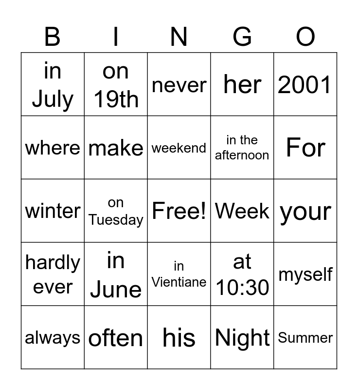 This bingo card has a free space and 24 words: in June, often, weekend, always, 2001, in July, where, on 19th, Week, in Vientiane, in the afternoon, winter, at 10:30, myself, make, Night, your, never, For, on Tuesday, Summer, hardly ever, her and his.