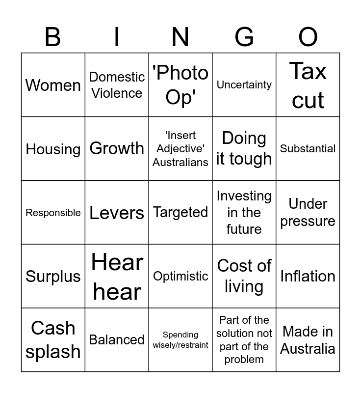 This bingo card has 25 words: Hear hear, Spending wisely/restraint, 'Insert Adjective' Australians, Cash splash, Tax cut, Women, Housing, Domestic Violence, Investing in the future, Optimistic, Doing it tough, Responsible, Cost of living, Inflation, Growth, Made in Australia, Under pressure, 'Photo Op', Substantial, Levers, Targeted, Balanced, Surplus, Uncertainty and Part of the solution not part of the problem.