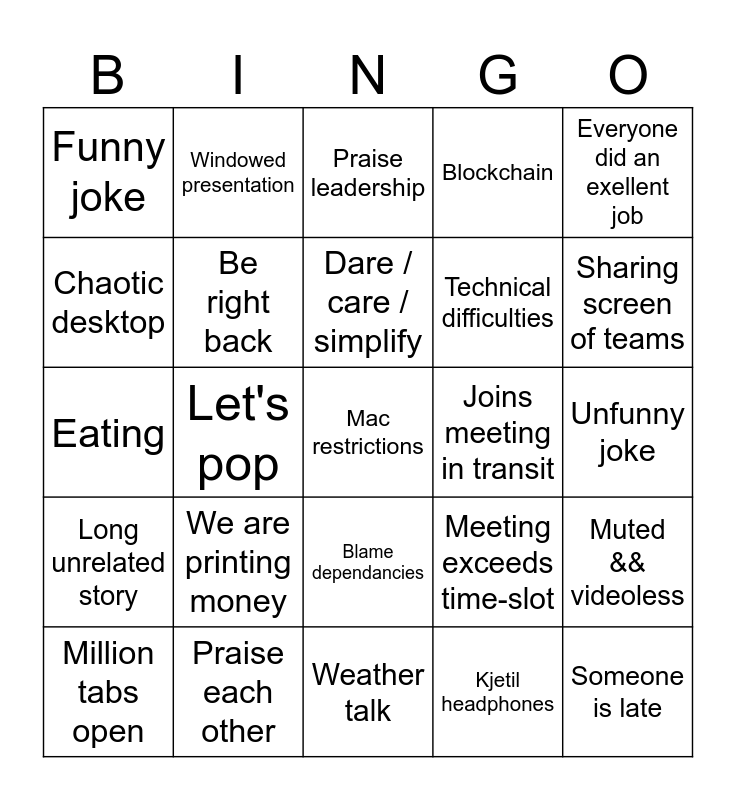 This bingo card has 35 words: Accidentally shares private DM's, AI mentioned, AWS issues, Be right back, Blame dependancies, Blockchain, Chaotic desktop, Corporate buzz words, Dare / care / simplify, Don't be quiet, Eating, Everyone did an exellent job, Foreign language, Forgot to mute, Funny joke, Joins meeting in transit, Kjetil headphones, Let's pop, Long unrelated story, Mac restrictions, Meeting exceeds time-slot, Million tabs open, Muted && videoless, Praise each other, Praise leadership, Sharing screen of teams, Someone is late, Sorry I was muted, Technical difficulties, Unfunny joke, VPN issues, Weather talk, We are printing money, Windowed presentation and You are muted.