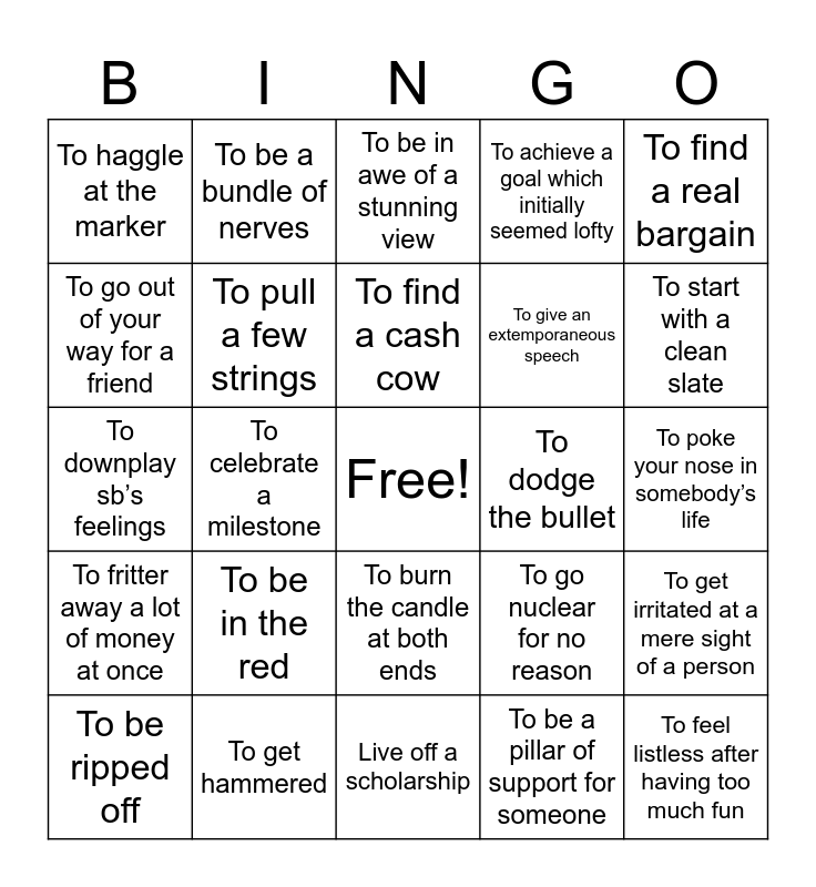 This bingo card has a free space and 25 words: To be in the red, Live off a scholarship, To find a cash cow, To be ripped off, To find a real bargain, To haggle at the marker, To go out of your way for a friend, To be a bundle of nerves, To dodge the bullet, To burn the candle at both ends, To give an extemporaneous speech, To downplay sb’s feelings, To go nuclear for no reason, To get irritated at a mere sight of a person, To pull a few strings, To hit the hay at 8 p.m., To poke your nose in somebody’s life, To be in awe of a stunning view, To start with a clean slate, To celebrate a milestone, To feel listless after having too much fun, To get hammered, To fritter away a lot of money at once, To achieve a goal which initially seemed lofty and To be a pillar of support for someone.