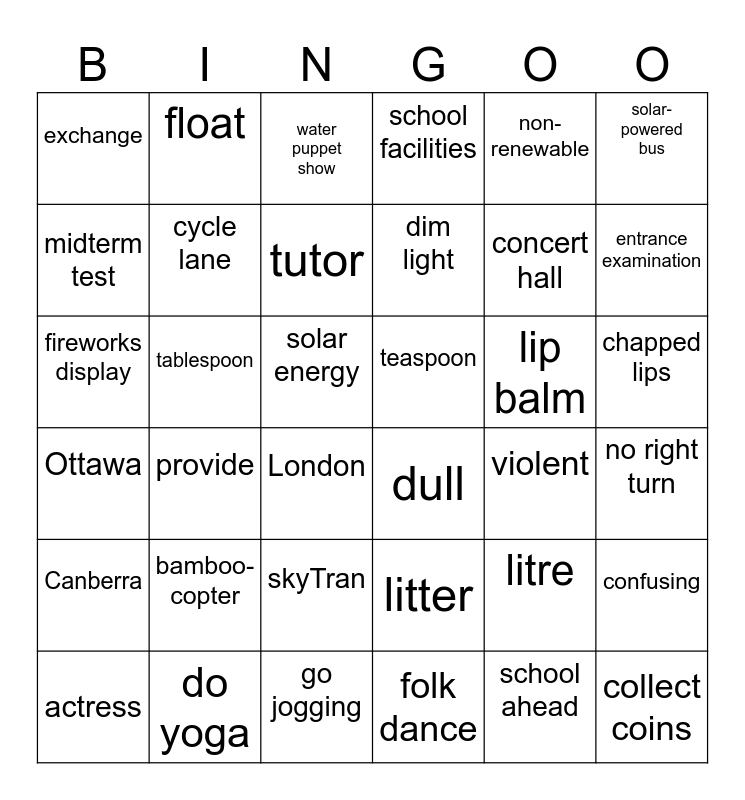 This bingo card has 36 words: Ottawa, provide, go jogging, dim light, lip balm, chapped lips, exchange, do yoga, water puppet show, litter, concert hall, solar-powered bus, Canberra, tablespoon, tutor, school facilities, litre, no right turn, midterm test, cycle lane, London, dull, violent, confusing, fireworks display, float, solar energy, folk dance, non-renewable, entrance examination, actress, bamboo-copter, skyTran, teaspoon, school ahead and collect coins.
