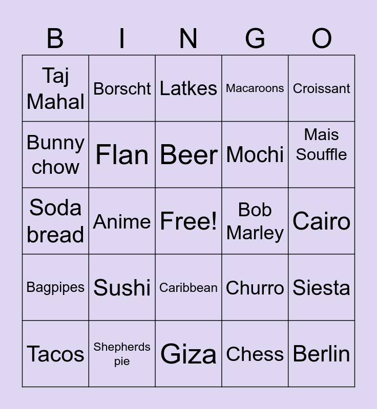 This bingo card has a free space and 24 words: Sushi, Shepherds pie, Beer, Tacos, Croissant, Taj Mahal, Bunny chow, Borscht, Bob Marley, Caribbean, Mochi, Soda bread, Churro, Siesta, Flan, Chess, Cairo, Latkes, Mais Souffle, Anime, Berlin, Bagpipes, Macaroons and Giza.