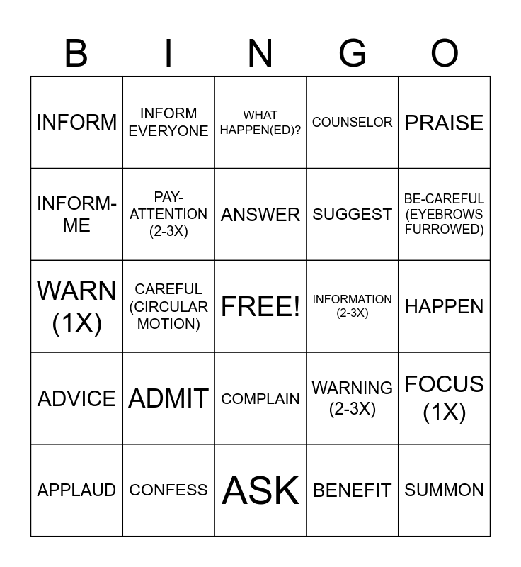 This bingo card has a free space and 24 words: ADMIT, CONFESS, ANSWER, APPLAUD, PRAISE, INFORM, INFORM-ME, INFORM EVERYONE, INFORMATION (2-3X), COMPLAIN, SUGGEST, WARN (1X), WARNING (2-3X), FOCUS (1X), PAY-ATTENTION (2-3X), BENEFIT, HAPPEN, WHAT HAPPEN(ED)?, BE-CAREFUL (EYEBROWS FURROWED), CAREFUL (CIRCULAR MOTION), SUMMON, ADVICE, COUNSELOR and ASK.