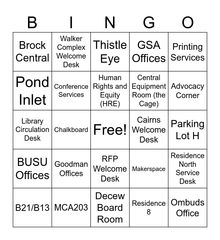 This bingo card has a free space and 24 words: Goodman Offices, MCA203, Human Rights and Equity (HRE), B21/B13, Printing Services, Brock Central, Pond Inlet, Walker Complex Welcome Desk, Cairns Welcome Desk, RFP Welcome Desk, Central Equipment Room (the Cage), Library Circulation Desk, Makerspace, Residence North Service Desk, Conference Services, Residence 8, Parking Lot H, Thistle Eye, Advocacy Corner, Chalkboard, Ombuds Office, BUSU Offices, GSA Offices and Decew Board Room.