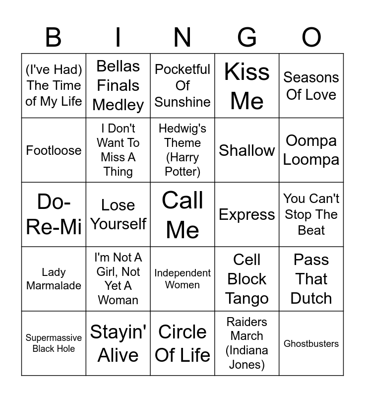 This bingo card has a free space and 54 words: I'm Just Ken, Lady Marmalade, Jai Ho, Can't Fight The Moonlight, Independent Women, Fame, Kiss Me, Perfect Day, Footloose, Men In Black, (I've Had) The Time of My Life, Nothing's Gonna Stop Us Now, Stayin' Alive, Supermassive Black Hole, Lovefool, Circle Of Life, Ghostbusters, Shallow, You're The One That I Want, You Can't Stop The Beat, Cell Block Tango, One Night Only, Express, Seasons Of Love, I Will Always Love You, Bellas Finals Medley, Theme From Jurassic Park, Star Wars (Main Theme), Mission Impossible Theme, Raiders March (Indiana Jones), Skyfall, Dance The Night, Happy, Can't Stop The Feeling!, Pocketful Of Sunshine, 9 To 5, Do-Re-Mi, Pass That Dutch, Gimme! Gimme! Gimme!, I Don't Want To Miss A Thing, Tomorrow, School Of Rock, Jump, The Greatest Show, I'm Not A Girl, Not Yet A Woman, Check On It, We're All In This Together, Murder On The Dancefloor, Hedwig's Theme (Harry Potter), Lose Yourself, Oompa Loompa, I'm Still Standing, Eye Of The Tiger and Don't Stop Me Now.