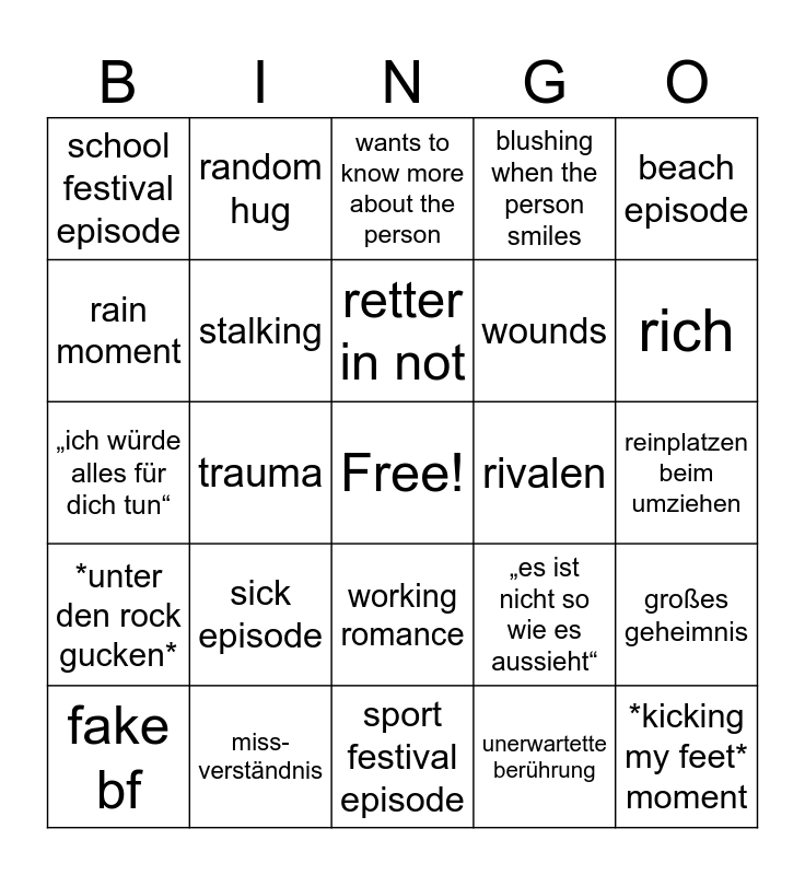 This bingo card has a free space and 24 words: sick episode, miss- verständnis, retter in not, fake bf, beach episode, school festival episode, rain moment, random hug, rivalen, working romance, wounds, „ich würde alles für dich tun“, „es ist nicht so wie es aussieht“, großes geheimnis, stalking, unerwartette berührung, reinplatzen beim umziehen, wants to know more about the person, rich, trauma, *kicking my feet* moment, *unter den rock gucken*, blushing when the person smiles and sport festival episode.