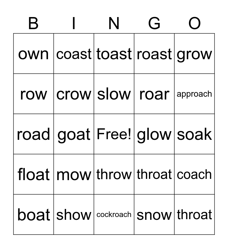 This bingo card has a free space and 26 words: throw, snow, slow, show, grow, own, row, coast, soak, throat, roar, road, coach, boat, goat, soap, roast, float, toast, throat, approach, cockroach, glow, mow, crow and blow.