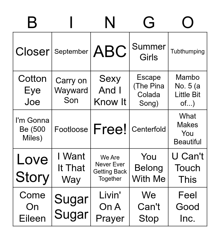 This bingo card has a free space and 85 words: 9 to 5, A Thousand Miles, ABC, Africa, All The Small Things, Baby, Barbie Girl, Brown Eyed Girl, Build Me Up Buttercup, Bye Bye Bye, Call Me Maybe, Careless Whisper, Carry on Wayward Son, Centerfold, Chicken Fried, Closer, Come On Eileen, Cotton Eye Joe, Dancing Queen, Dreams, Drift Away, Escape (The Pina Colada Song), Feel Good Inc., Fireflies, Footloose, Friday, Gonna Make You Sweat, Happy, Hey, Soul Sister, I Knew You Were Trouble, I Want It That Way, Ice Ice Baby, I'd Do Anything For Love, I'm Gonna Be (500 Miles), It's Gonna Be Me, Livin' la Vida Loca, Livin' On A Prayer, Love Shack, Love Story, Mambo No. 5 (a Little Bit of...), Mamma Mia, Man! I Feel Like A Woman!, MMMBop, Mr. Brightside, My Sharona, Never Gonna Give You Up, One Week, Party In The U.S.A., Piano Man, Runaround Sue, September, Sexy And I Know It, Shut Up and Dance, Since U Been Gone, Sk8er Boi, Spirit in the Sky, Sugar Sugar, Summer Girls, Sweet Caroline, Take Me Home, Country Roads, Take on Me, Thank God I'm a Country Boy, That Don't Impress Me Much, The Safety Dance, Tiny Dancer, Tubthumping, Two Princes, U Can't Touch This, Uptown Girl, Video Killed The Radio Star, Wagon Wheel, Wake Me Up Before You Go-Go, Walking in Memphis, Walking On Sunshine, Wannabe, We Are Never Ever Getting Back Together, We Can't Stop, We Didn't Start the Fire, We're Not Gonna Take It, What Is Love, What Makes You Beautiful, Wonderwall, Wouldn't It Be Nice, You Belong With Me and You Get What You Give.