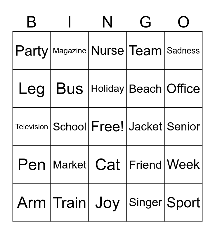 This bingo card has a free space and 98 words: Wedding, Birthday, Adult, Senior, Animal, Bird, Fish, Hamster, Zoo, Museum, Language, Bookstore, Store, Market, Newspaper, Magazine, Television, Radio, Internet, Website, Email, Camera, Picture, Song, Dance, Party, Joy, Dream, Idea, Problem, Arm, Leg, Solution, Job, Office, Meeting, Team, Project, School, Test, Vacation, Holiday, Beach, Park, Dog, Cat, Table, Chair, Car, Book, Ball, Bag, Tree, House, Computer, Phone, Pen, Paper, Flower, Sun, Moon, River, Mountain, Lake, Ocean, Child, Parent, Student, Teacher, Doctor, Nurse, Artist, Singer, Actor, Movie, Music, City, Country, Game, Sport, Bicycle, Bus, Train, Airport, Money, Time, Day, Night, Week, Month, Year, Friend, Family, Love, Jacket, Happiness, Sadness and Anger.
