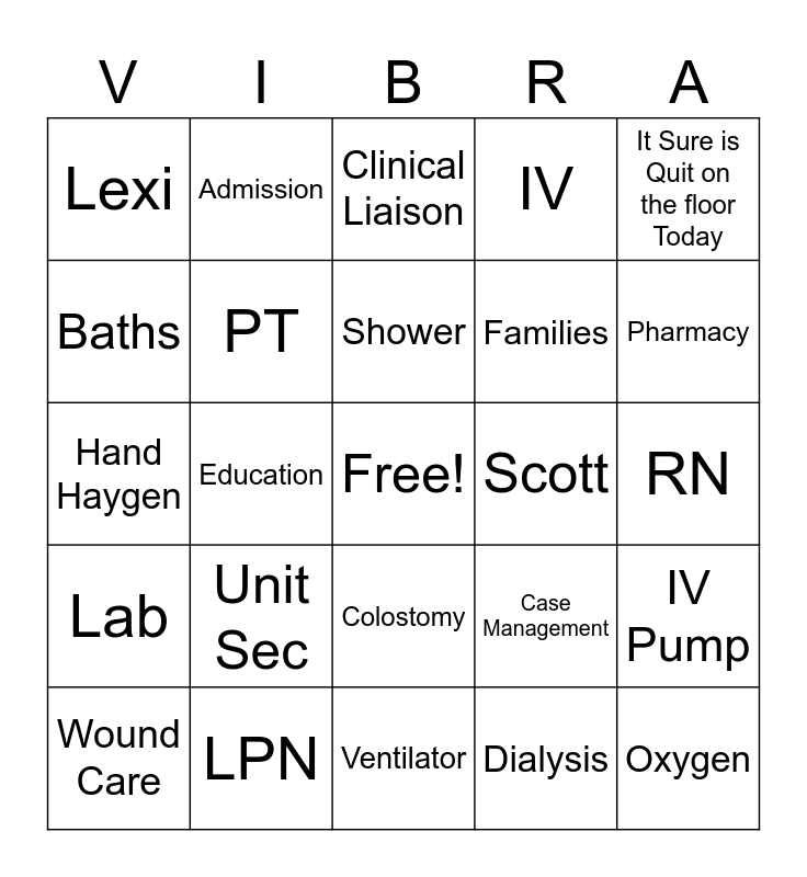 This bingo card has a free space and 34 words: CNA, Dialysis, House Keeping, Bath, Lab, PT, It Sure is Quit on the floor Today, Wound Care, Admission, RT, Shower, Clinical Liaison, PCT, Kristina, Scott, Pharmacy, LPN, Hand Haygen, Unit Sec, Case Management, Colostomy, Dr. Addy, Lexi, RN, Ventilator, Oxygen, IV, LTACH, Families, Baths, NOC, Education, IV Pump and MOU.