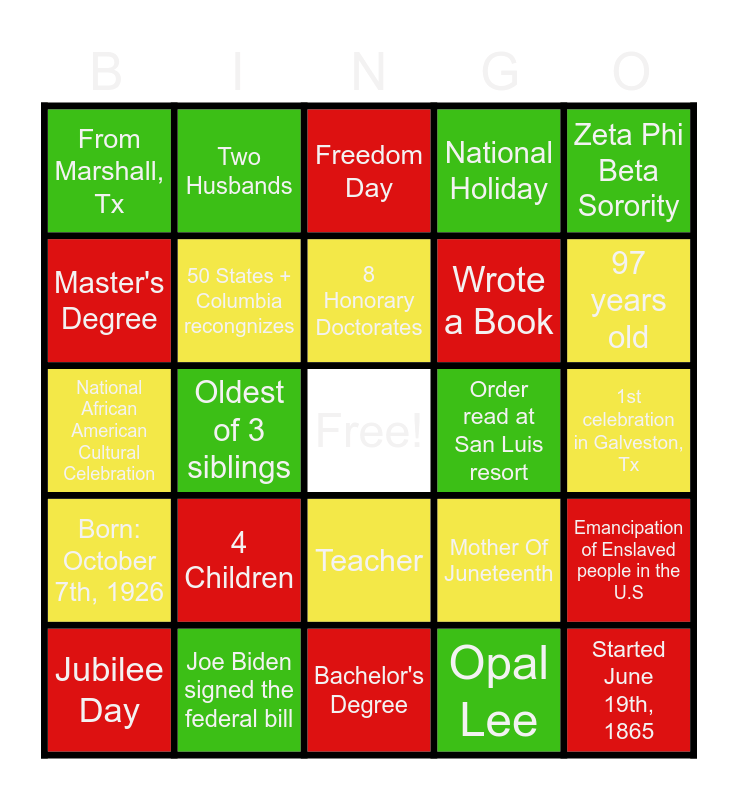 This bingo card has a free space and 24 words: 4 Children, Joe Biden signed the federal bill, 8 Honorary Doctorates, Jubilee Day, Zeta Phi Beta Sorority, From Marshall, Tx, Master's Degree, Two Husbands, Order read at San Luis resort, Teacher, Wrote a Book, National African American Cultural Celebration, Mother Of Juneteenth, Emancipation of Enslaved people in the U.S, 50 States + Columbia recongnizes, Opal Lee, 1st celebration in Galveston, Tx, Freedom Day, 97 years old, Oldest of 3 siblings, Started June 19th, 1865, Born: October 7th, 1926, National Holiday and Bachelor's Degree.