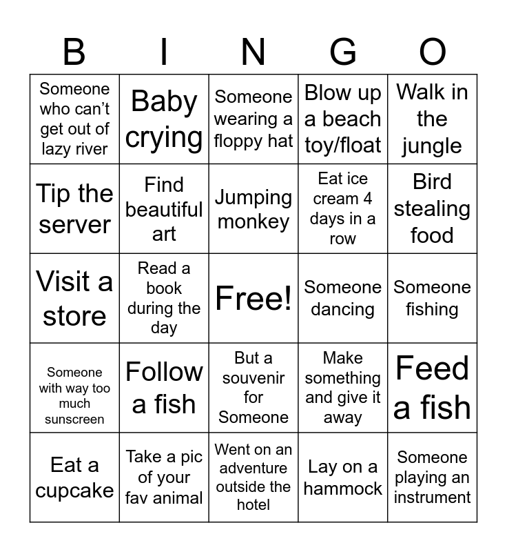 This bingo card has a free space and 24 words: Eat a cupcake, Follow a fish, Jumping monkey, Lay on a hammock, Walk in the jungle, Someone who can’t get out of lazy river, Baby crying, Someone wearing a floppy hat, Someone dancing, Someone fishing, Visit a store, Find beautiful art, Make something and give it away, Feed a fish, Tip the server, Take a pic of your fav animal, Went on an adventure outside the hotel, Blow up a beach toy/float, Bird stealing food, Someone with way too much sunscreen, Read a book during the day, But a souvenir for Someone, Eat ice cream 4 days in a row and Someone playing an instrument.