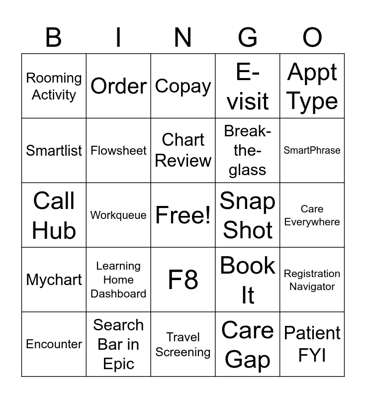 This bingo card has a free space and 24 words: Learning Home Dashboard, Search Bar in Epic, Chart Review, Encounter, Appt Type, Rooming Activity, Smartlist, Order, Snap Shot, F8, Break-the-glass, Call Hub, Book It, Registration Navigator, Flowsheet, Care Gap, Care Everywhere, Copay, SmartPhrase, Workqueue, Patient FYI, Mychart, E-visit and Travel Screening.