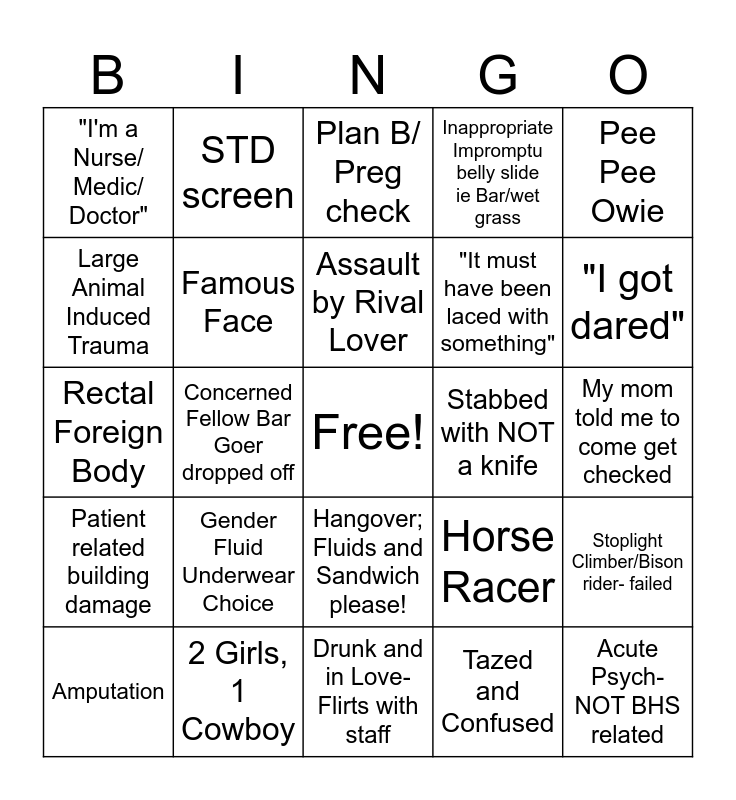 This bingo card has a free space and 24 words: Gender Fluid Underwear Choice, 2 Girls, 1 Cowboy, Assault by Rival Lover, Amputation, Pee Pee Owie, "I'm a Nurse/ Medic/ Doctor", Large Animal Induced Trauma, STD screen, Stabbed with NOT a knife, Hangover; Fluids and Sandwich please!, "It must have been laced with something", Rectal Foreign Body, Horse Racer, Stoplight Climber/Bison rider- failed, Famous Face, Tazed and Confused, My mom told me to come get checked, Plan B/ Preg check, "I got dared", Concerned Fellow Bar Goer dropped off, Acute Psych- NOT BHS related, Patient related building damage, Inappropriate Impromptu belly slide ie Bar/wet grass and Drunk and in Love- Flirts with staff.