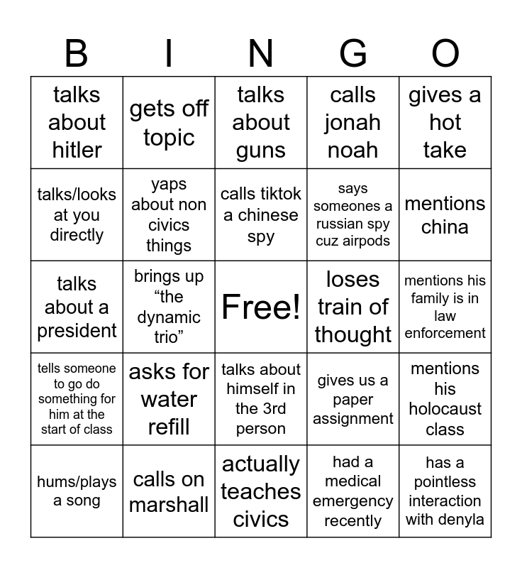 This bingo card has a free space and 24 words: asks for water refill, calls on marshall, calls tiktok a chinese spy, hums/plays a song, gives a hot take, talks about hitler, talks/looks at you directly, gets off topic, loses train of thought, talks about himself in the 3rd person, says someones a russian spy cuz airpods, talks about a president, gives us a paper assignment, mentions his holocaust class, yaps about non civics things, had a medical emergency recently, mentions his family is in law enforcement, talks about guns, mentions china, brings up “the dynamic trio”, has a pointless interaction with denyla, tells someone to go do something for him at the start of class, calls jonah noah and actually teaches civics.