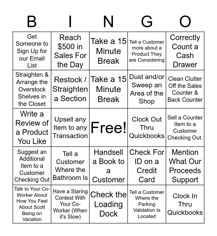 This bingo card has a free space and 24 words: Tell a Customer Where the Bathroom Is, Have a Staring Contest With Your Co-Worker (When it's Slow), Take a 15 Minute Break, Talk to Your Co-Worker About How You Feel About Scott Being on Vacation, Correctly Count a Cash Drawer, Get Someone to Sign Up for our Email List, Straighten & Arrange the Overstock Shelves in the Closet, Reach $500 in Sales For the Day, Clock Out Thru Quickbooks, Handsell a Book to a Customer, Dust and/or Sweep an Area of the Shop, Write a Review of a Product You Like, Check For ID on a Credit Card, Mention What Our Proceeds Support, Restock / Straighten a Section, Tell a Customer Where the Parking Validation Is Located, Sell a Counter Item to a Customer Checking Out., Take a 15 Minute Break, Clean Clutter Off the Sales Counter & Back Counter, Upsell any Item to any Transaction, Clock In Thru Quickbooks, Suggest an Additional Item to a Customer Checking Out, Tell a Customer more about a Product They are Considering and Check the Loading Dock.