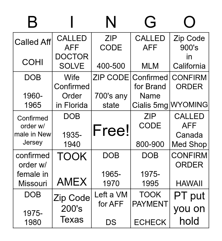 This bingo card has a free space and 24 words: TOOK AMEX, Zip Code 200's Texas, ZIP CODE 700's any state, DOB 1975-1980, Zip Code 900's in California, Called Aff COHI, DOB 1960-1965, CALLED AFF DOCTOR SOLVE, ZIP CODE 800-900, DOB 1965-1970, Confirmed for Brand Name Cialis 5mg, Confirmed order w/ male in New Jersey, DOB 1975-1995, CONFIRM ORDER HAWAII, Wife Confirmed Order in Florida, TOOK PAYMENT ECHECK, CALLED AFF Canada Med Shop, ZIP CODE 400-500, CONFIRM ORDER WYOMING, DOB 1935-1940, PT put you on hold, confirmed order w/ female in Missouri, CALLED AFF MLM and Left a VM for AFF DS.