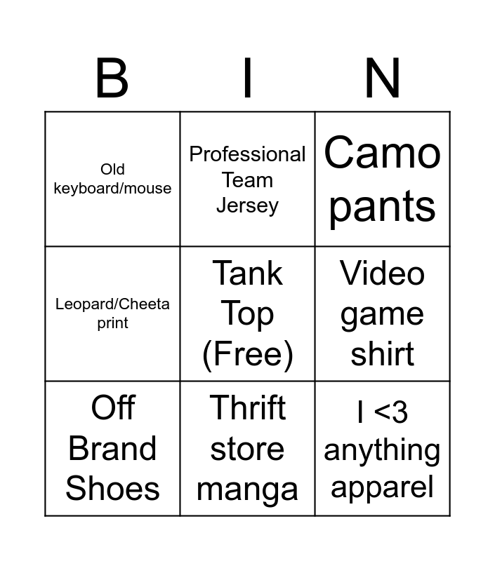 This bingo card has a free space and 8 words: Video game shirt, Camo pants, Professional Team Jersey, Off Brand Shoes, Old keyboard/mouse, I <3 anything apparel, Leopard/Cheeta print and Thrift store manga.