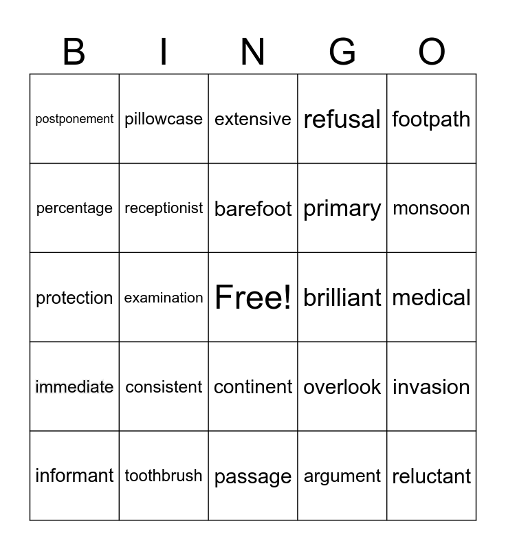 This bingo card has a free space and 31 words: rooftop, toothbrush, barefoot, showroom, footpath, postponement, examination, passage, primary, reluctant, informant, consistent, argument, excessive, immediate, gradually, continent, brilliant, medical, boomerang, pillowcase, notebook, overlook, monsoon, protection, receptionist, extensive, refusal, invasion, percentage and preview.