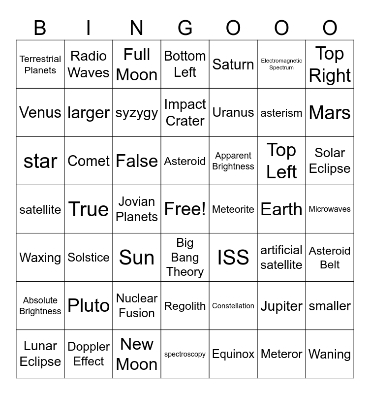 This bingo card has a free space and 48 words: Constellation, asterism, spectroscopy, True, False, Microwaves, Radio Waves, Doppler Effect, Electromagnetic Spectrum, Big Bang Theory, Top Right, Bottom Left, Top Left, Apparent Brightness, Absolute Brightness, Earth, Venus, Mars, Jupiter, Saturn, Uranus, Jovian Planets, Terrestrial Planets, larger, smaller, syzygy, Solar Eclipse, Lunar Eclipse, Asteroid, Comet, Meteror, Meteorite, Asteroid Belt, Pluto, satellite, ISS, artificial satellite, star, Sun, Nuclear Fusion, Waxing, Waning, Full Moon, New Moon, Impact Crater, Regolith, Solstice and Equinox.
