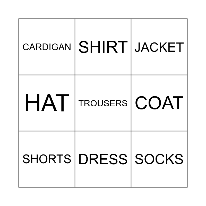 This bingo card has a free space and 11 words: T-SHIRT, DRESS, SOCKS, SHORTS, SHIRT, JACKET, COAT, SHOES, HAT, CARDIGAN and TRACKSUIT.