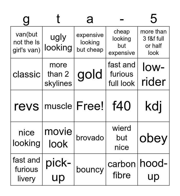 This bingo card has a free space and 24 words: fast and furious livery, movie look, gold, carbon fibre, more than 3 f&f full or half look, van(but not the ls girl's van), ugly looking, expensive looking but cheap, f40, kdj, revs, more than 2 skylines, wierd but nice, obey, classic, pick-up, bouncy, cheap looking but expensive, low-rider, nice looking, muscle, brovado, fast and furious full look and hood-up.