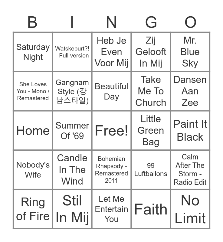 This bingo card has a free space and 91 words: Track Name, Hotel California - 2013 Remaster, Bohemian Rhapsody - Remastered 2011, Stairway to Heaven - 1990 Remaster, Het Land Van Maas En Waal, The Scientist, Mag Ik Dan Bij Jou ( Single Version ), Oceaan, Happy, Radar Love, Papaoutai, 't Dondert En 't Bliksemt, Skyfall, Paint It Black, Light My Fire, Beautiful Day, Africa, Over De Muur, Under the Bridge, (Sittin' On) the Dock of the Bay, Dromen Zijn Bedrog, Tears in Heaven, Let Me Entertain You, Het Regent Zonnestralen, Home, Stil In Mij, Billie Jean, Losing My Religion, Mamma Mia, Heroes - 1999 Remaster, Zing - Vecht - Huil - Bid - Lach - Werk en Bewonder, Calm After The Storm - Radio Edit, Jailhouse Rock, Nobody's Wife, Saturday Night, Zij Gelooft In Mij, Heb Je Even Voor Mij, Born in the U.S.A., Summer Of '69, Dansen Aan Zee, Ring of Fire, She Loves You - Mono / Remastered, 't Giet Zoas 't Giet, 'k Heb Je Lief, Zelfs Je Naam Is Mooi, 99 Luftballons, I Would Stay, Jolene, Every Breath You Take - Remastered 2003, Chan Chan, Pak Maar M'n Hand, Take Me To Church, Relax, American Pie, Livin' On A Prayer, The Final Countdown, Little Green Bag, Daddy Cool, Wake Me Up Before You Go-Go, Take on Me, Flappie, Venus, Paradise By the Dashboard Light, Ironic, Oerend Hard, It's Raining Men, Sinds 1 Dag of 2 (32 Jaar), Faith, Don't Speak, Boogie Wonderland, Candle In The Wind, No Limit, Barbie Girl, Captain Jack - Short Mix, Watskeburt?! - Full version, Gangnam Style (강남스타일), Even Aan Mijn Moeder Vragen, I Want It That Way, Wannabe, Holiday Rap - Version 1986, Born To Be Wild, Mr. Blue Sky, One Way Or Another, Kom Van Dat Dak Af, Ademnood, The Second Waltz (from Eyes Wide Shut), Girls Just Want to Have Fun, Livin' la Vida Loca, Celebration - Single Version, Another Brick In The Wall - 2001 Remastered Version and It's Like That.