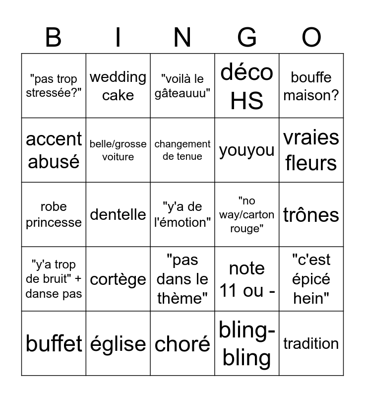 This bingo card has a free space and 24 words: cortège, église, changement de tenue, buffet, bouffe maison?, "pas trop stressée?", accent abusé, wedding cake, "no way/carton rouge", "pas dans le thème", youyou, robe princesse, note 11 ou -, "c'est épicé hein", belle/grosse voiture, bling-bling, trônes, "voilà le gâteauuu", vraies fleurs, dentelle, tradition, "y'a trop de bruit" + danse pas, déco HS and choré.