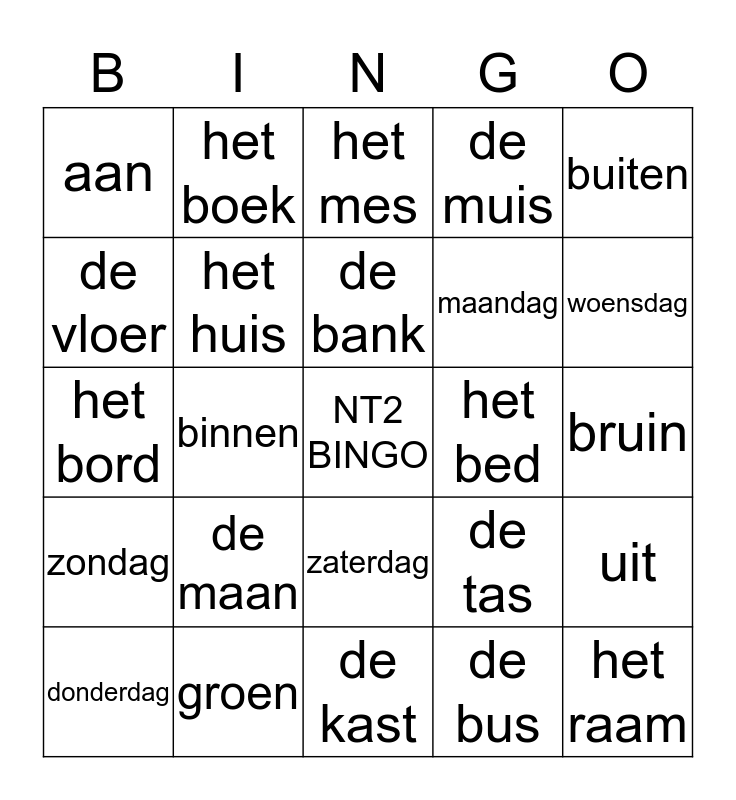 This bingo card has a free space and 48 words: de jas, het raam, de man, de kast, de maan, de stoel, het boek, de broek, de vloer, de hoed, het huis, de muis, uit, de tas, de pen, de tafel, de bank, het bed, de deur, buiten, binnen, de bus, aan, maandag, dinsdag, woensdag, donderdag, vrijdag, zaterdag, zondag, onder, boven, vandaag, morgen, groen, rood, geel, bruin, zwart, wit, oranje, paars, het mes, de vork, het bord, de lepel, het glas and het kopje.
