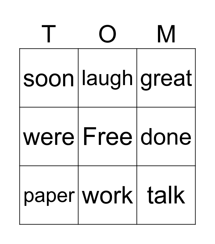 This bingo card has a free space and 8 words: done, great, laugh, paper, soon, talk, were and work.