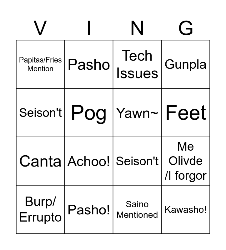 This bingo card has 18 words: Achoo!, Kawasho!, Tech Issues, Papitas/Fries Mention, Seison't, Gunpla, Burp/ Errupto, Pasho, Feet, Canta, Saino Mentioned, Seison't, Me Olivde /I forgor, Pog, Yawn~, Papitas/Fries Mention, Pasho! and Kawasho!.