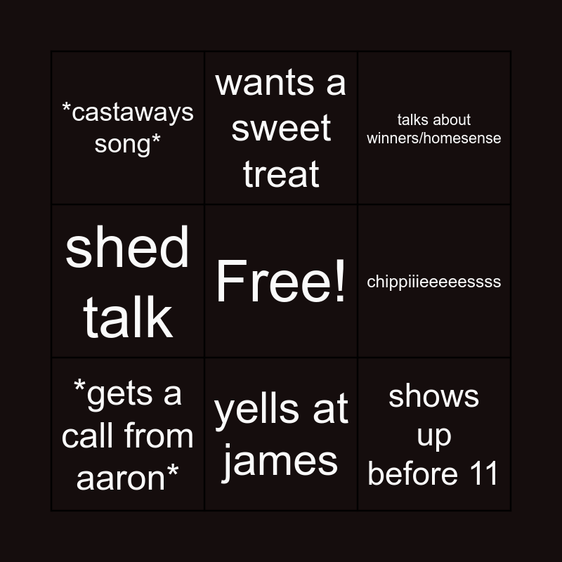 This bingo card has a free space and 9 words: *gets a call from aaron*, talks about winners/homesense, wants a sweet treat, shed talk, *castaways song*, chippiiieeeeessss, shows up before 11, asks james for grab her water and yells at james.