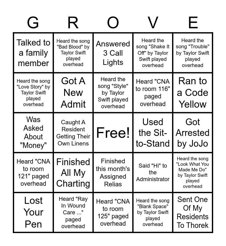 This bingo card has a free space and 29 words: Lost Your Pen, Remembered To Wear My Name Tag, Caught A Resident Getting Their Own Linens, Found Your Pen, Talked to a family member, Answered 3 Call Lights, Got A New Admit, Finished All My Charting, Used the Sit-to-Stand, Heard "Ray In Wound Care ..." paged overhead, Got Arrested by JoJo, Sent One Of My Residents To Thorek, Heard "CNA to room 125" paged overhead, Heard the song "Blank Space" by Taylor Swift played overhead, Ran to a Code Yellow, Sent One Of My Residents To Highland Park, Finished this month's Assigned Relias, Heard "CNA to room 121" paged overhead, Heard the song "Trouble" by Taylor Swift played overhead, Was Asked About "Money", Said "Hi" to the Administrator, Used the Hoyer Lift, Heard "CNA to room 116" paged overhead, Heard the song "Love Story" by Taylor Swift played overhead, Heard the song "Shake It Off" by Taylor Swift played overhead, Heard the song "Bad Blood" by Taylor Swift played overhead, Heard the song "Look What You Made Me Do" by Taylor Swift played overhead, Heard the song "Style" by Taylor Swift played overhead and Heard the song "Anti-Hero" by Taylor Swift played overhead.