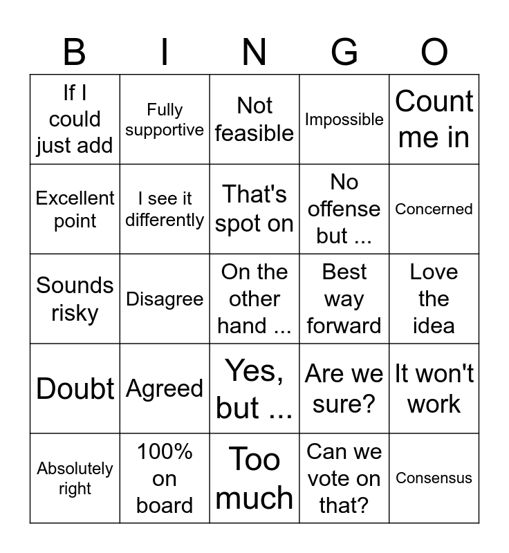 This bingo card has a free space and 24 words: Agreed, 100% on board, That's spot on, Absolutely right, Count me in, If I could just add, Excellent point, Fully supportive, Best way forward, Yes, but ..., No offense but ..., Sounds risky, Are we sure?, It won't work, I see it differently, Can we vote on that?, Love the idea, Not feasible, Concerned, Disagree, Consensus, Doubt, Impossible and Too much.