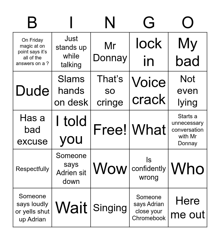 This bingo card has a free space and 36 words: What’s I do throws arms up, Bro, Tsk sound, Slams hands on desk, Is confidently wrong, Respectfully, That’s so cringe, Buddy, My bad, Asks a question Andes in the last 3 minutes, I told you, lock in, Imagine, What, Not even lying, On Friday magic at on point says it’s all of the answers on a ?, Mewing, Someone says Adrien sit down, Here me out, Mr Donnay, Starts a unnecessary conversation with Mr Donnay, Who, Wait, Someone says loudly or yells shut up Adrian, Singing, Just stands up while talking, Has a bad excuse, Rubs eyebrows, Voice crack, Dude, Keeps talking when told to stop, Tells people to be quiet then talks himself, Someone says Adrian close your Chromebook, Wow, Asks a common sense? and Asks a ? Answered in the last 3 minutes or is on the board.
