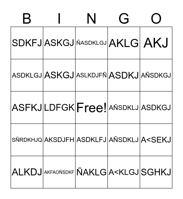 This bingo card has a free space and 24 words: AKSDJFH, AKFAOÑSDKF, ASLKDJFÑ, ALKDJ, AKJ, SDKFJ, ASDKLGJ, ASKGJ, AÑSDKLJ, ASDKLFJ, ASDKJ, ASFKJ, AÑSDKLJ, A<SEKJ, ASKGJ, A<KLGJ, ASDKGJ, ÑASDKLGJ, AÑSDKGJ, LDFGK, SGHKJ, SÑRDKHJQ, AKLG and ÑAKLG.