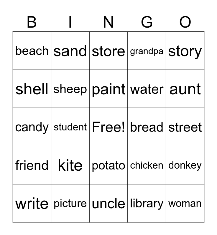 This bingo card has a free space and 24 words: kite, picture, paint, write, story, beach, shell, sand, bread, potato, water, candy, chicken, donkey, sheep, library, street, store, aunt, student, woman, friend, grandpa and uncle.